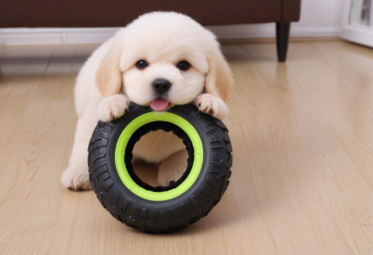 Top view of german shepherd puppy sleeping peacefully on floor with blue dotted gloves. Crop of cute black and brown dog napping isolated on white background. Concept of domestic animals.